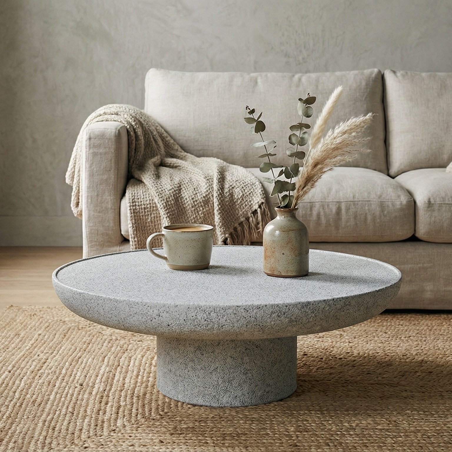 DECOMAXI Tasarım Notu: Durable serisi, masif tabanı ve geniş tablasıyla mekanın sosyal merkezini oluşturur. Betonun ham gücü ile dairesel formun dinginliğini bu tasarımda keşfedin.