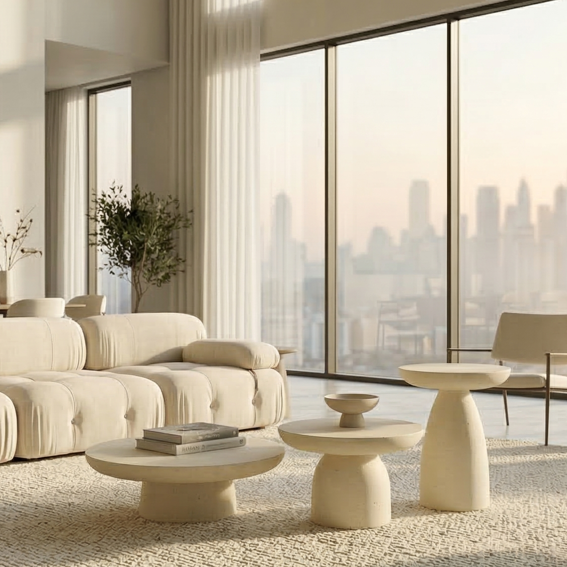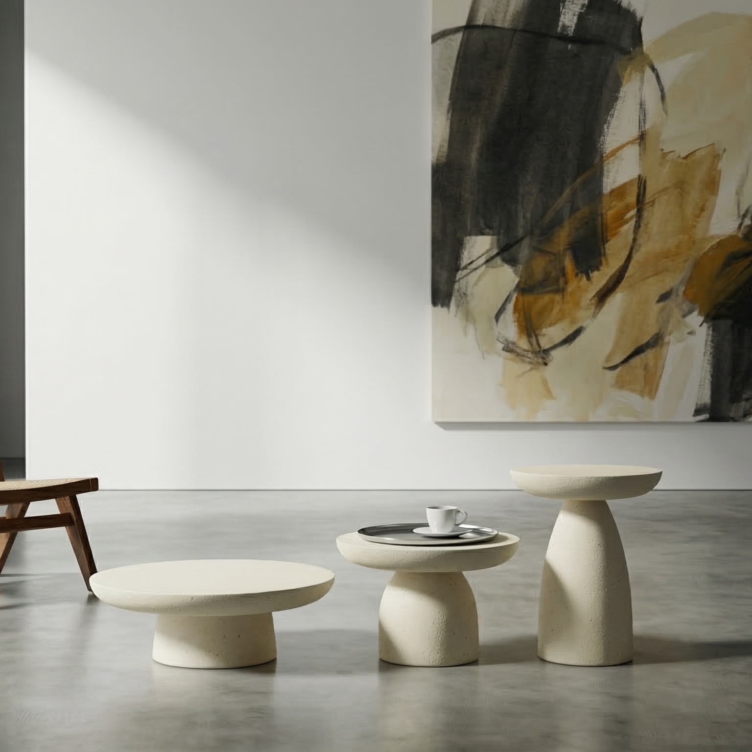 DECOMAXI Tasarım Notu: OASIS serisi, monolitik kaide yapısı ve dingin tabla tasarımıyla mekanda bir denge unsuru oluşturur. Betonun brütalist ruhu, bu masada modern bir mimari dil birliğiyle evinizde hissedilir.