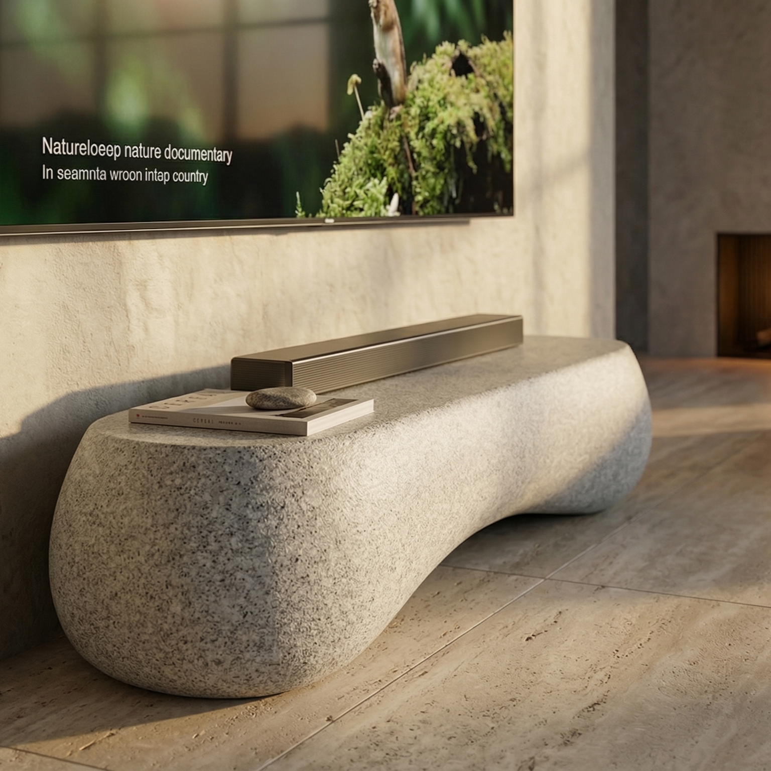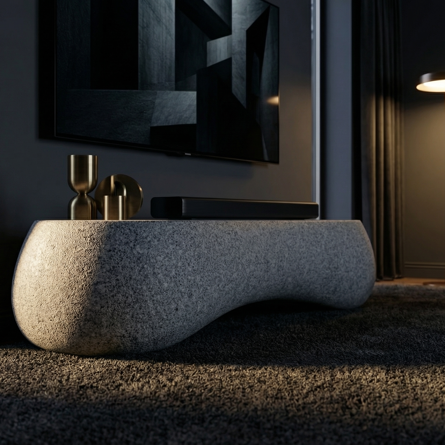 DECOMAXI Tasarım Notu: FLO serisi, monolitik yapısıyla sadece bir TV ünitesi değil, aynı zamanda antrelerde veya yatak uçlarında bir dresuar/bench olarak da kullanılabilen çok yönlü bir mimari objedir. Betonun brütalist ruhunu akışkan formlarla evinizde hissedin.